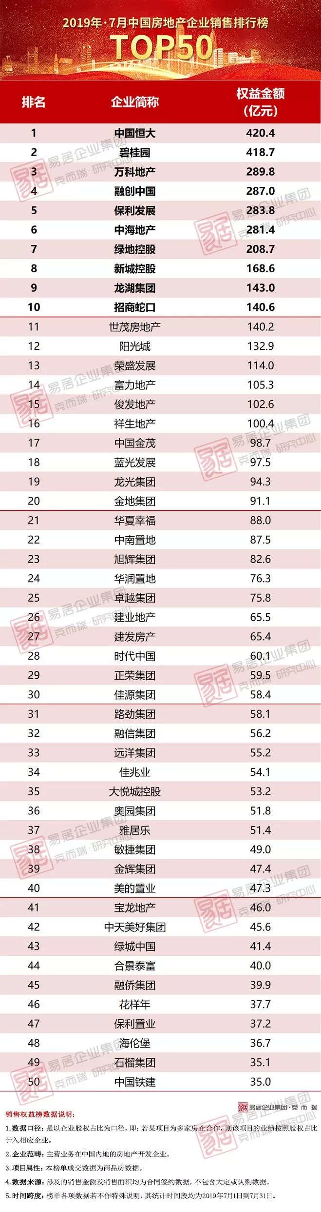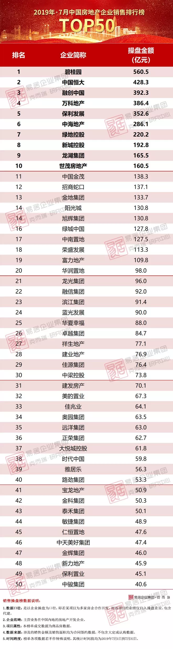 2019年7月中国房地产企业销售金额TOP50排行榜