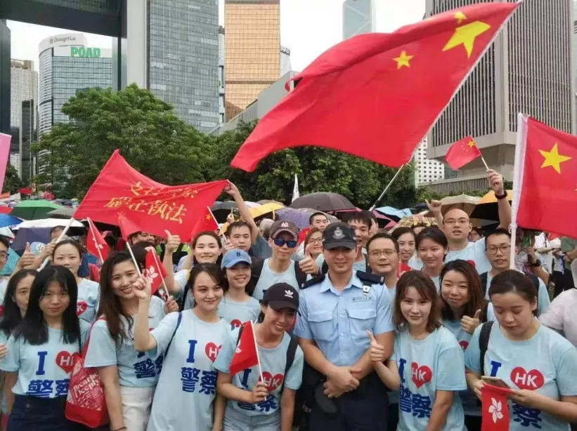 当日下着小雨,但依然挡不住香港市民的热情,47.6万人次顶风冒雨从四面八方聚集。人群中,鲜艳的中华人民共和国国旗和香港特别行政区区旗分外耀眼。集会主持人庄严指出,国旗、国徽是国家标志,象征着国家尊严不容破坏!“反暴力,救香港”条幅随处可见,“香港加油!警队加油”的呼喊声此起彼伏。