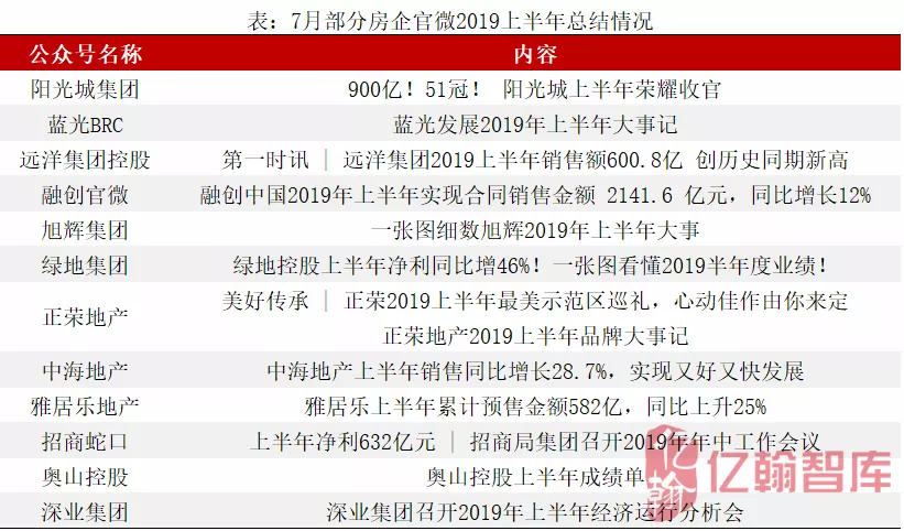 截至7月31日,十余家房企发布2019年中期业绩预告,大部分企业均实现不同幅度上涨,其中金科集团和蓝光发展归属母公司净利润实现翻倍。此外,据亿翰智库统计,2019年1-7月,典型企业业绩完成度大多在60%左右,上半年行业实现超预期增长。典型房企官微针对“半年度”关键词宣传达54次。