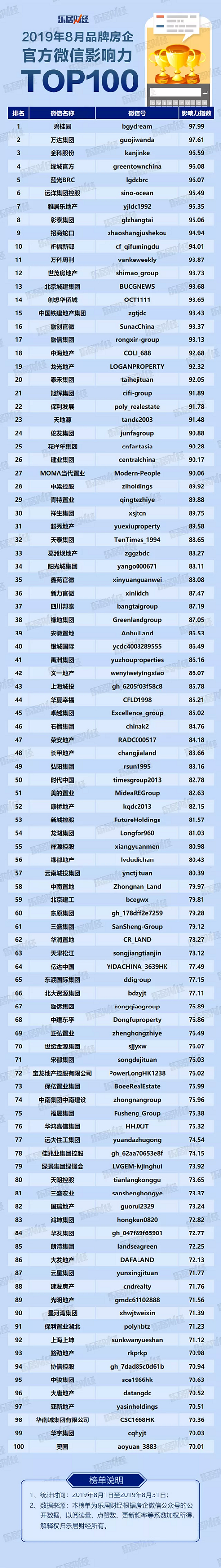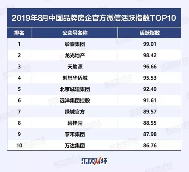 乐居财经收集了332个房企微信公众号作为“品牌房企官方微信影响力排行榜”的样本库,8月份共有156个账号有更新。榜单影响力指数取决于房企官方微信的活跃指数、传播指数和爆文指数等多项数据。