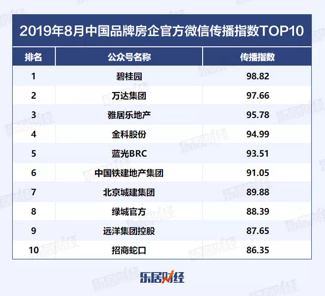 8月品牌房企官方微信传播指数TOP10中,碧桂园问鼎冠军,万达集团排名大幅上升,位列第二,雅居乐地产位列季军。第四到第十分别为:金科股份、蓝光BRC、中国铁建地产集团、北京城建集团、绿城官方、远洋集团控股、招商蛇口。