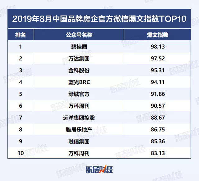 8月品牌房企官方微信爆文指数TOP10中,前三甲分别是:碧桂园、万达集团、金科股份。第四到第十分别为:蓝光BRC、绿城官方、万科周刊、远洋集团控股、雅居乐地产、融信集团、万科周刊。