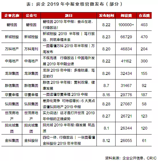 从今年企业中报宣传看,播报方式更加多元,整体的阅读量有所提升,多数房企官宣均阅读破万。不少房企在业绩官宣之后,以详细数据解读、第三方机构背书、媒体花样解读等形式持续发声。如融信在年报发出后,归总了各大券商机构对于公司业绩的专业评价,从投资者角度再一次肯定了公司的业绩发展;花样年以“作虎而不是猫”为题,援引媒体趣味详解,剖析企业半年成绩。这些方式都从侧面烘托了企业积极的社会形象和良好的投资预期,提高了公司的美誉度和市场信心。