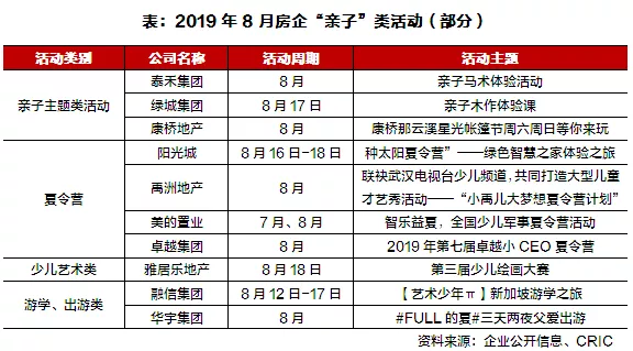 夏令营活动类,如美的置业智乐益夏,全国少儿军事夏令营活动,从 7月8日粤桂区域开营,到8月16日沪苏区域结营,历时近40天, 横跨全国11个区域, 共计开展13期活动, 参与总人数超2000人。活动内容包含高尔夫体验、国学课堂、趣味运动、航空研学、实用安全技能学习……为孩子们献上一份缤纷多彩的成长礼物。活动受到了家长和少儿的一致好评。除美的置业外,禹洲地产、阳光城、祥生等企业的也纷纷推出了不同类型的夏令营活动。