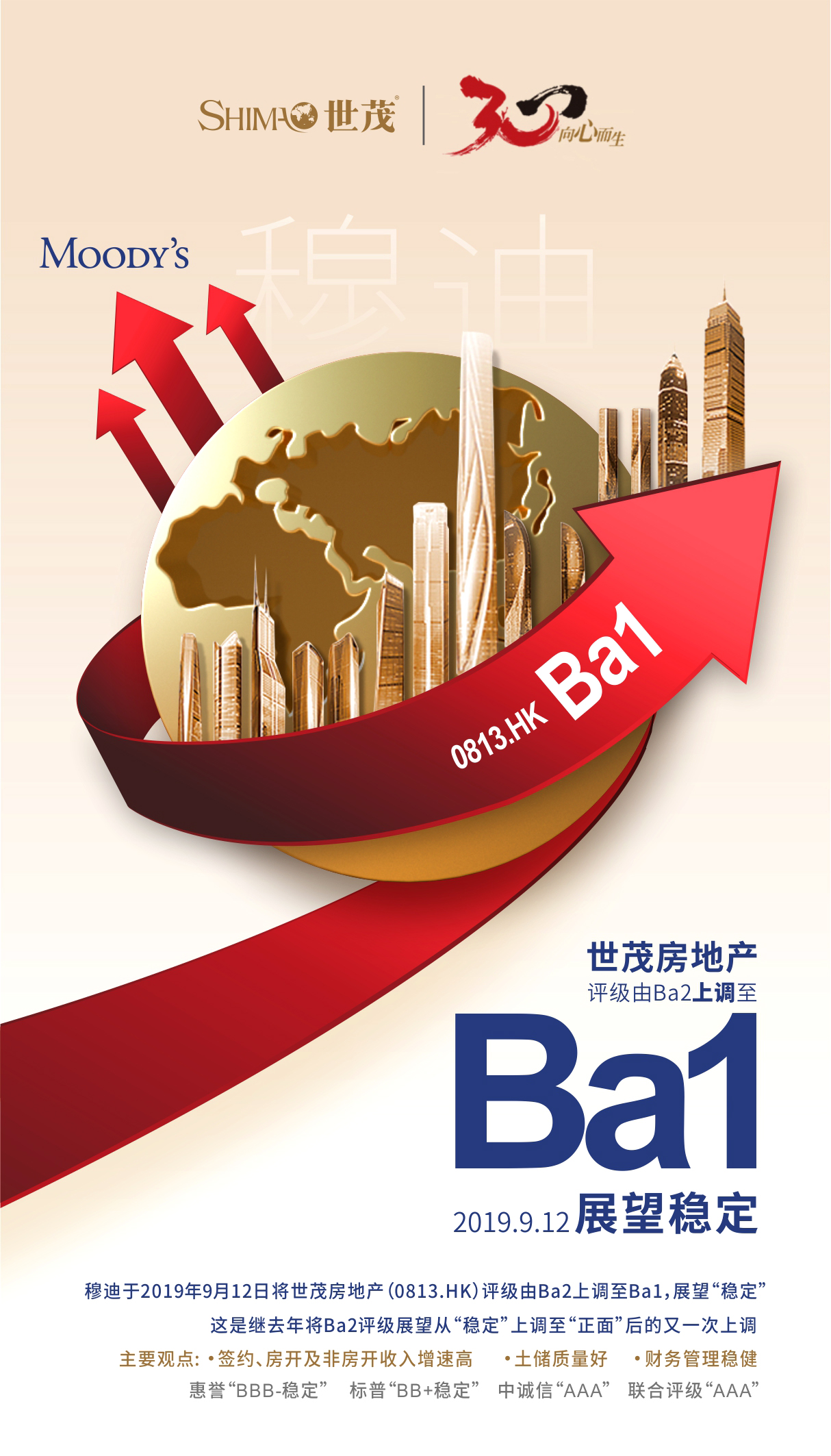 穆迪于2019年9月12日将球王会体育在线房地产(0813.HK)评级由Ba2上调至Ba1,展望“稳定”。这是继去年将Ba2评级展望从“稳定”上调至“正面”后的又一次上调。